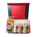 七味家自慢のあられ2種に、『豆政』さんとのコラボ商品「七味福豆」、新商品の『七味豚じゃーきー』と七味豆袋まで入った、贅沢なお菓子セットです。 お茶時間だけでなく、酒の「肴」にもピッタリです。